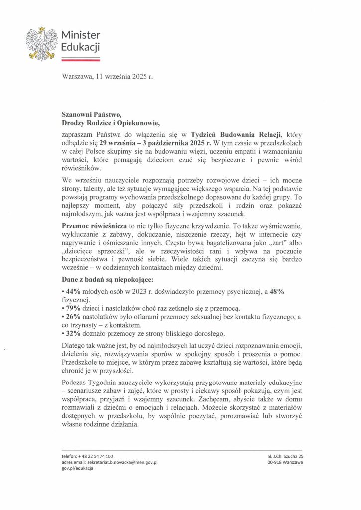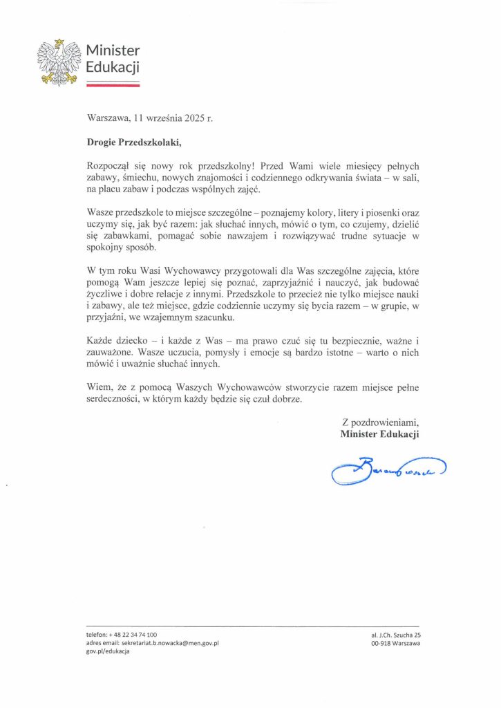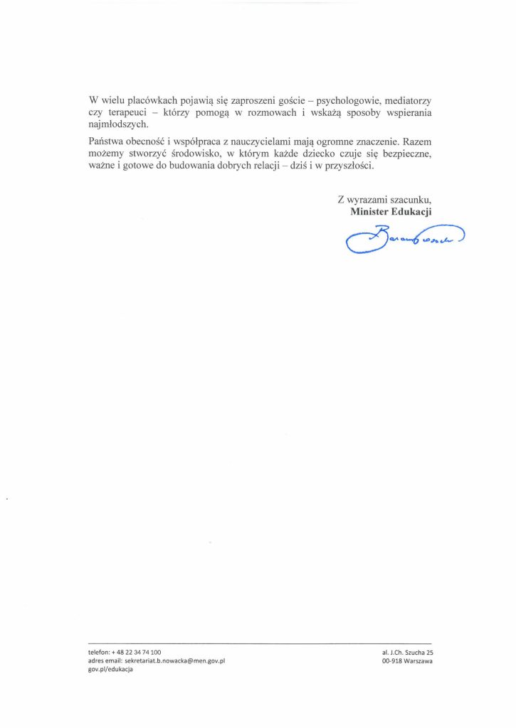 Z tej okazji zachęcamy rodziców do lektury gazetki znajdującej się przy głównym wejściu. Znajdują się na niej listy z Ministerstwa Edukacji Narodowej oraz numery telefonów, które mogą okazać się przydatne w sytuacjach kryzysowych.