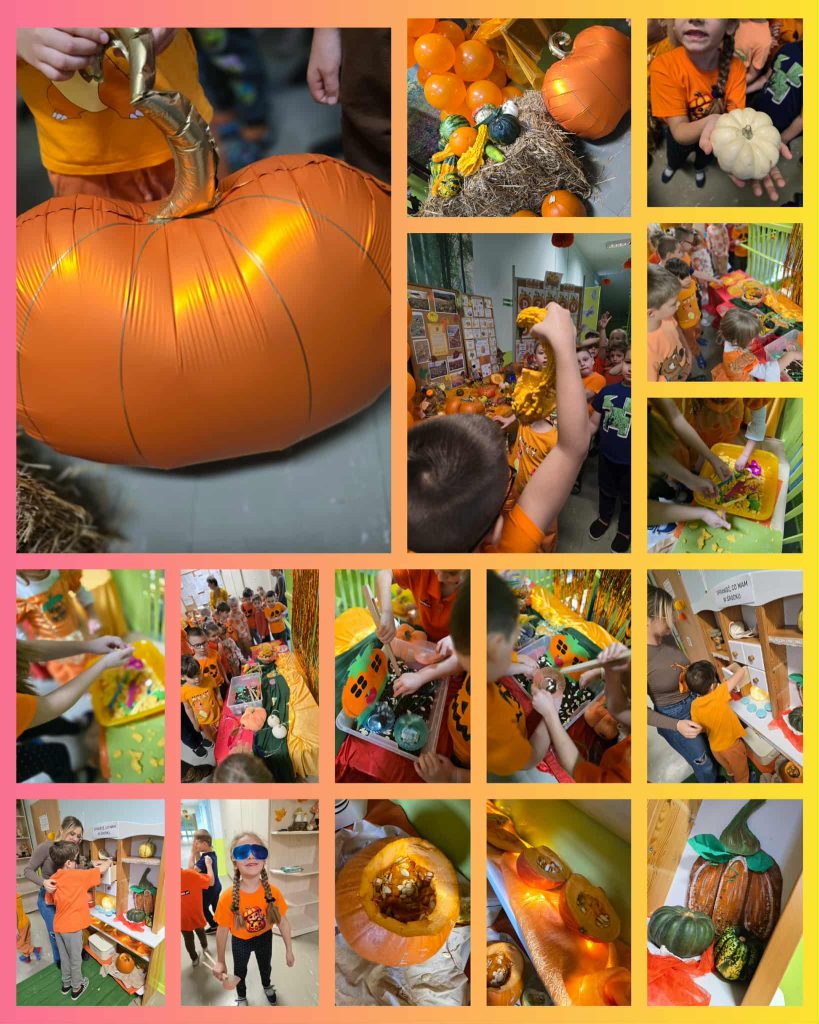 Tego dnia w całej placówce królował kolor pomarańczowy – każde dziecko miało na sobie choć jeden dyniowy element stroju, a sale i korytarze wypełniły się jesiennym klimatem. 🍂