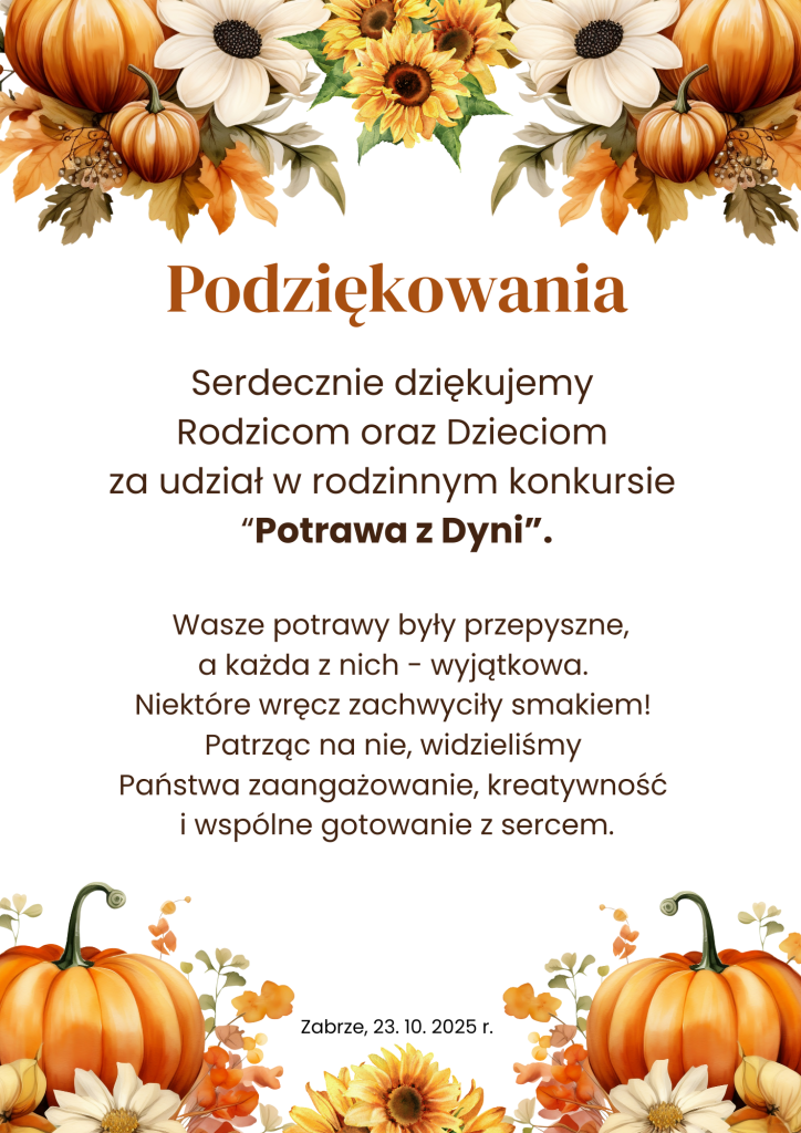 Serdecznie dziękujemy wszystkim rodzicom i dzieciom za udział, wspólną zabawę i stworzenie wspaniałej, jesiennej atmosfery pełnej zapachów, smaków i uśmiechu!