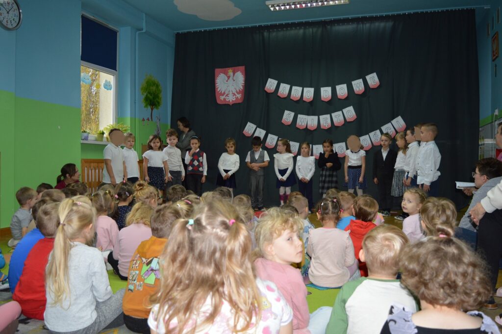 Starszaki z grupy wiewiórek zaprezentowały wiersze i piosenki patriotyczne. Wspólnie odśpiewaliśmy hymn Polski „Mazurek Dąbrowskiego”, którego autorem słów jest Józef Wybicki. Głównym celem spotkania było kształtowanie miłości i przywiązania do naszej ojczyzny, jego kultury i tradycji oraz poznanie symboli narodowych naszego kraju. Dziękujemy za ciekawą lekcję historii.