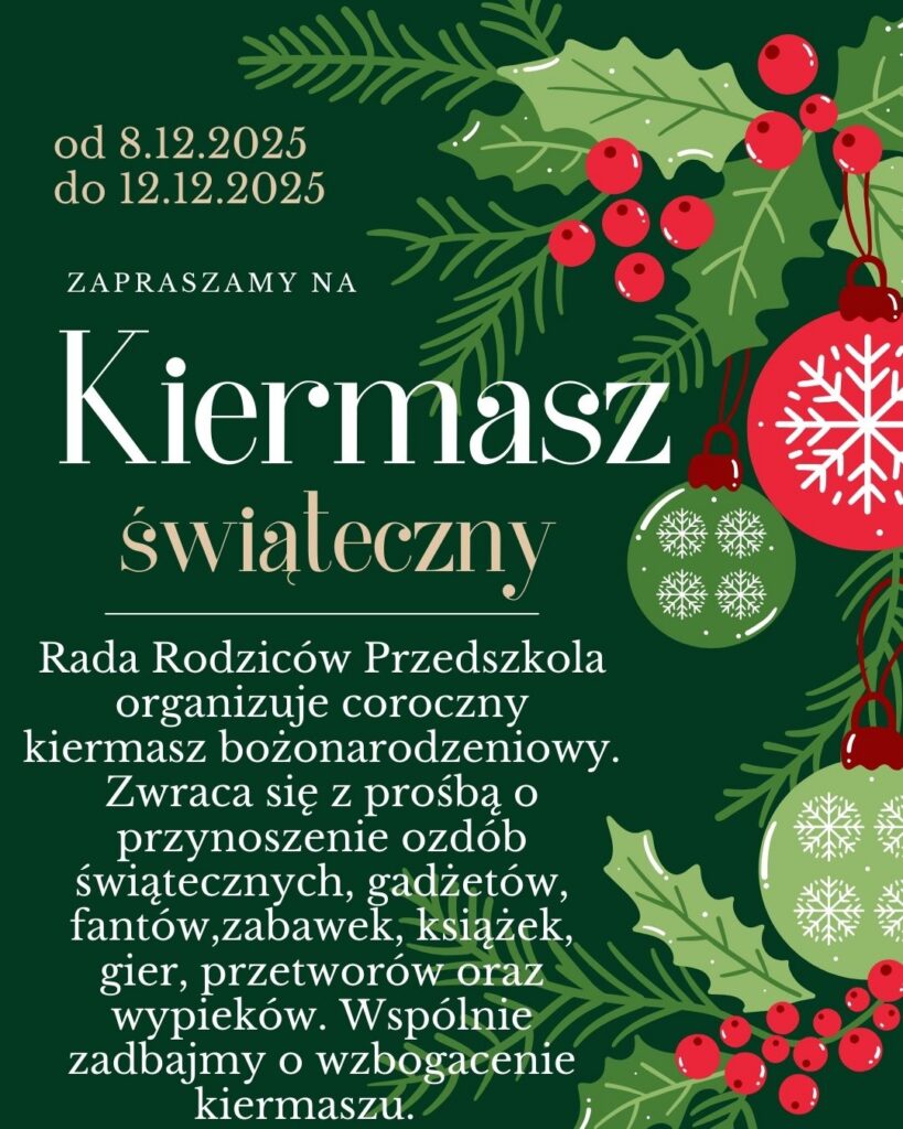 Rada Rodziców organizuje coroczny kiermasz świąteczny. Zwraca się z prośbą o przynoszenie ozdób świątecznych, gadżetów, fantów, zabawek, książek, gier, przetworów oraz wypieków. Wypieki proszę przynieść 12. grudnia rano, w tym dniu będą sprzedawane.
