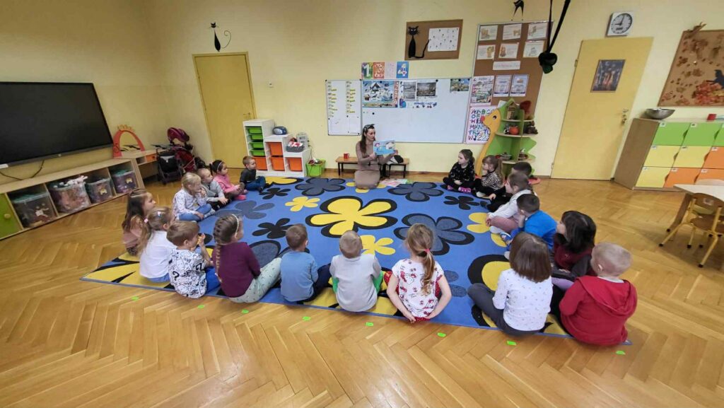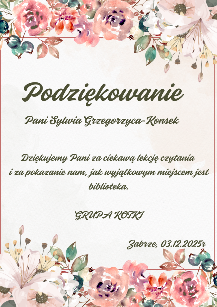 Grupa Kotków miała dziś wyjątkową przyjemność gościć Panią z Biblioteki nr 5. Podczas spotkania dzieci mogły dowiedzieć się, jak niezwykłym miejscem jest biblioteka — pełnym książek, historii i małych czytelniczych przygód. Pani bibliotekarka opowiadała o tym, jak wygląda praca w bibliotece, czym jest karta czytelnika oraz dlaczego warto odwiedzać to miejsce jak najczęściej. Nie zabrakło również wspólnego czytania — dzieci z dużym zaciekawieniem słuchały pięknie przeczytanej książki. To była inspirująca i bardzo radosna wizyta, która z pewnością zachęciła Kotki do częstszego sięgania po książki.