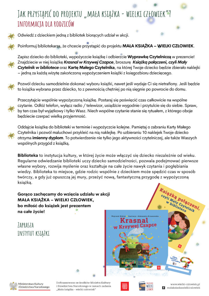 To niezwykła akcja, w której każde dziecko zapisane do biblioteki otrzymuje Wyprawkę Czytelniczą – w niej m.in. książkę „Krasnal w Krzywej Czapce”, broszurę dla rodziców oraz Kartę Małego Czytelnika. Za każdą wizytę i wypożyczenie książki dziecko otrzymuje naklejkę, a po uzbieraniu dziesięciu – imienny dyplom Małego Czytelnika.