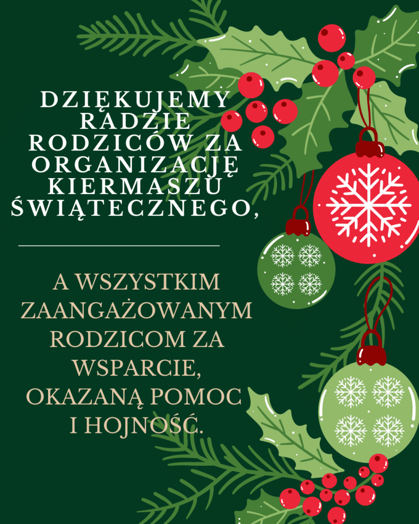 Przez ostatnie dwa tygodnie w naszym przedszkolu organizowany był kiermasz bożonarodzeniowy. Na stoiskach można było zobaczyć przepiękne ozdoby choinkowe, bombki, bałwanki, choinki, szyszki i stroiki. Można było spróbować domowych wypieków naszych rodziców. Kiermasz cieszył się dużym zainteresowaniem. Serdecznie dziękujemy Radzie Rodziców, Rodzicom i Dzieciom za pracę włożoną w przygotowania do kiermaszu i hojność.