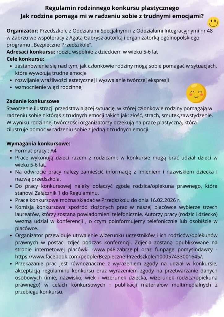 Zapraszamy do udziału w rodzinnym konkursie plastycznym „Jak rodzina pomaga mi w radzeniu sobie z trudnymi emocjami?” Celem konkursu jest zastanowienie się nad tym, jak członkowie rodziny mogą sobie pomagać w sytuacjach, które wywołują trudne emocje. Rozwijanie wrażliwości estetycznej i wyzwalanie twórczej ekspresji oraz wzmocnienie więzi rodzinnej, to także cele konkursu.
