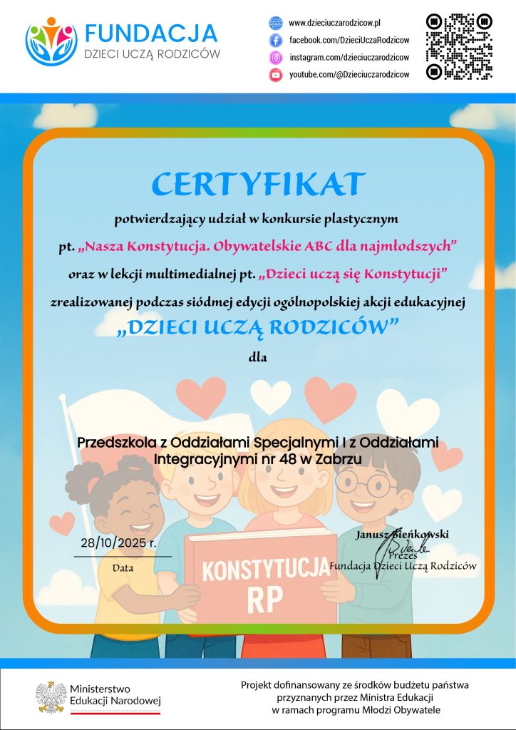 CERTYFIKAT POTWIERDZAJĄCY UDZIAŁ PLACÓWKI W PIĄTEJ EDYCJI OGÓLNOPOLSKIEJ AKCJI EDUKACYJNEJ „DZIECI UCZĄ RODZICÓW” W ROKU SZKOLNYM 2023/2024 DLA PRZEDSZKOLA Z ODDZIAŁAMI SPECJALNYMI I Z ODDZIAŁAMI INTEGRACYJNYMI NR 48 W ZABRZU