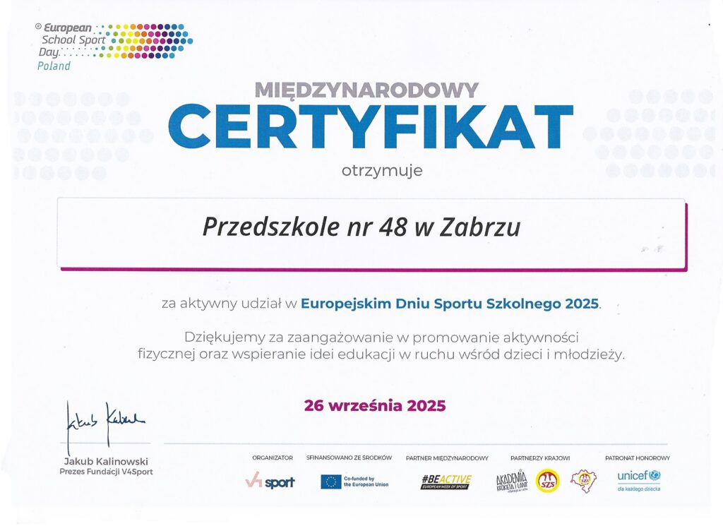 MIEDZYNARODOWY CERTYFIKAT DLA PRZEDSZKOLA NR 48 W ZABRZU ZA AKTYWNY UDZIAŁ W UROPEJSKIM DNIU SPORTU SZKOLNEGO 2024