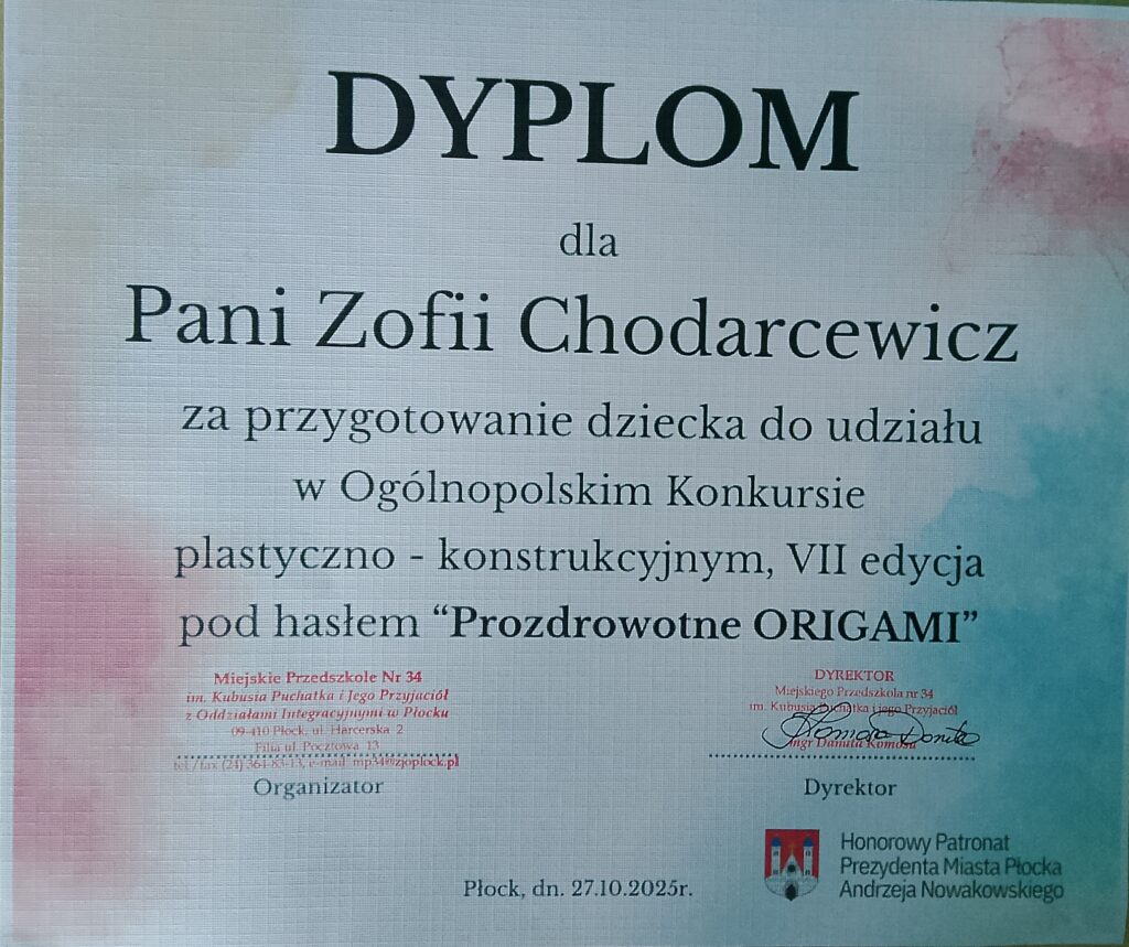 DYPLOM DLA PRZEDSZKOLA ZA PRZYGOTOWANIE LAUREATKI KONKURSU PLASTYCZNEGO