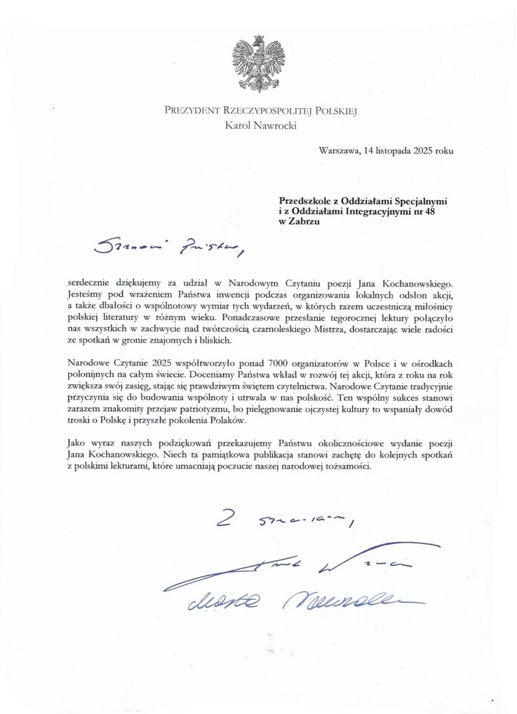 PODZIĘKOWANIE ZA UDZIAŁ W NARODOWYM CZYTANIU POEZJI JANA KOCHANOWSKIEGO