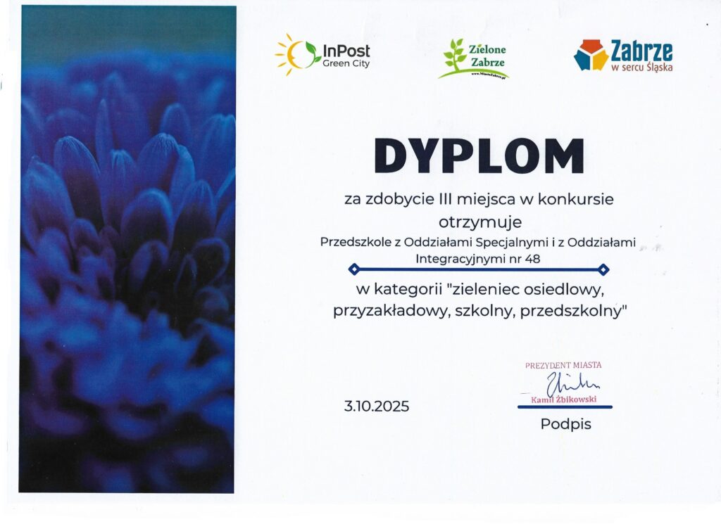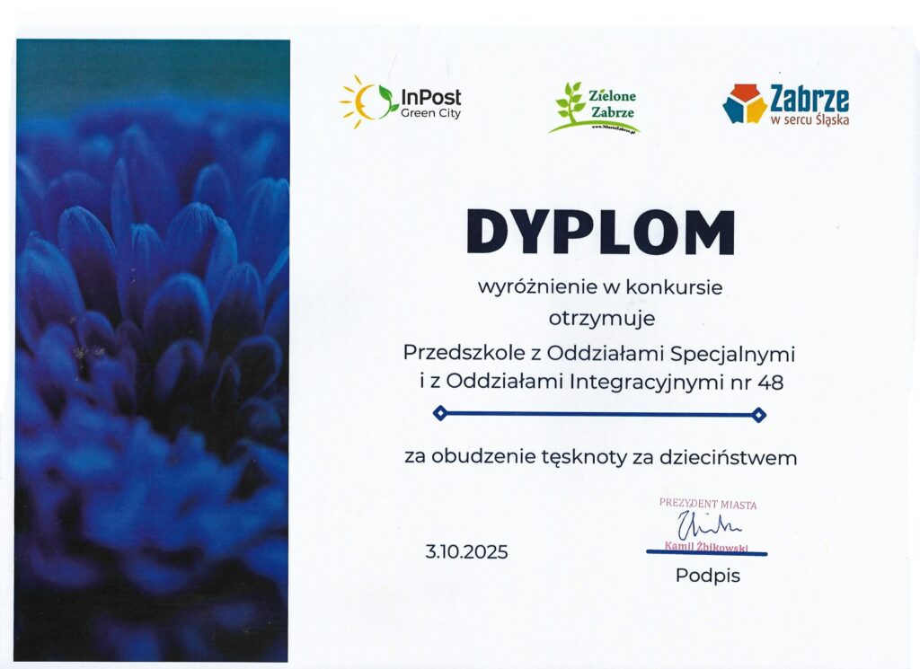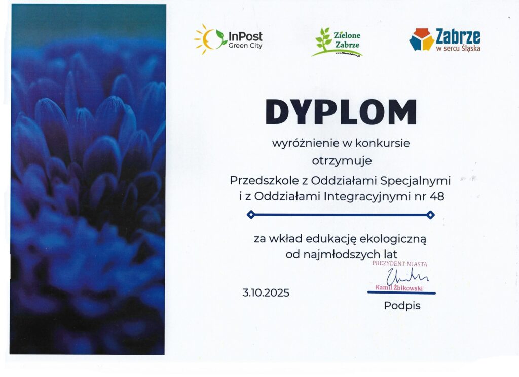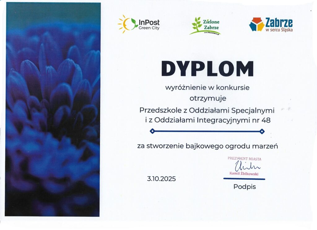 CRTYFIKAT DLA PRZEDSZKOLA Z ODDZIAŁAMI SPECJALNYMI I Z ODDZIAŁAMI INTEGRACYJNYMI NR 48 W ZABRZU