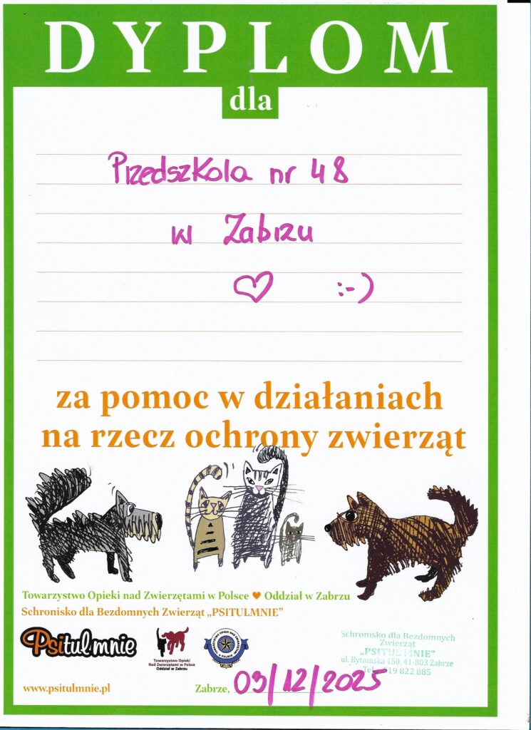 DYPLOM DLA PRZEDSZKOLA NR 48 Z ODDZIAŁAMI INTEGRACYJNYMI W ZABRZU ZA POMOC W DZIAŁANIACH NA RZECZ OCHRONY ZWIERZĄT