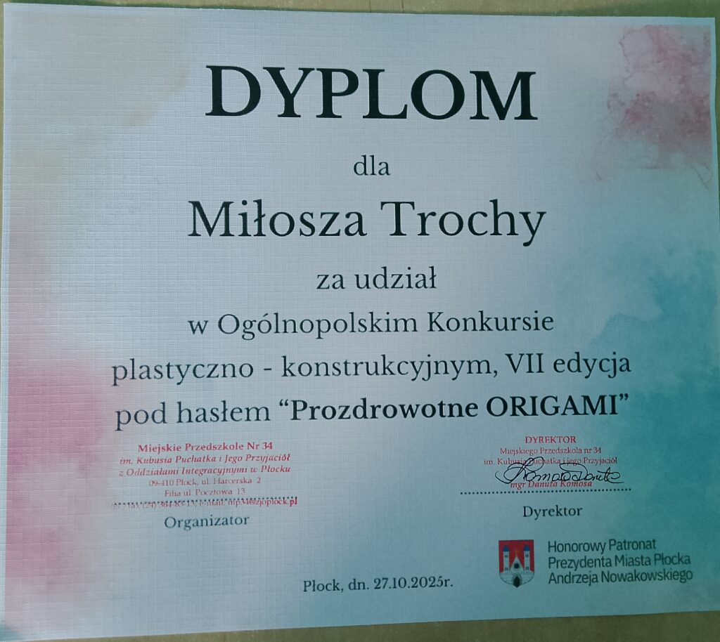 Dyplom dla Miłosza Trochy za udział w Ogólnopolskim Konkursie plastyczno-konstrukcyjnym „Prozdrowotne origami”