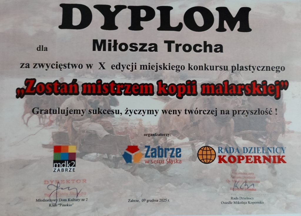 Dyplom dla Miłosza Trochy za zwycięstwo w X edycji miejskiego konkursu plastycznego „Zostań mistrzem kopii malarskiej”