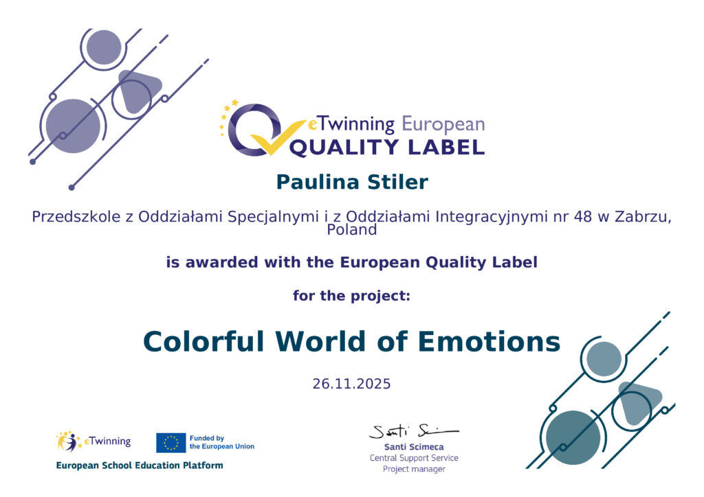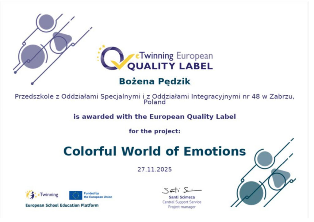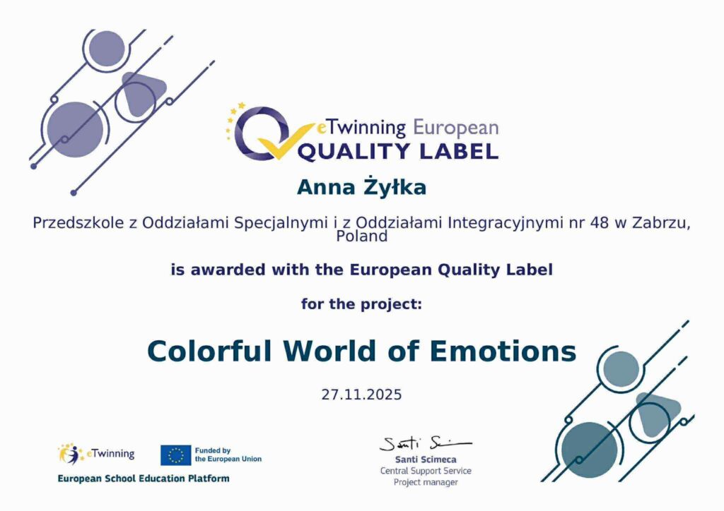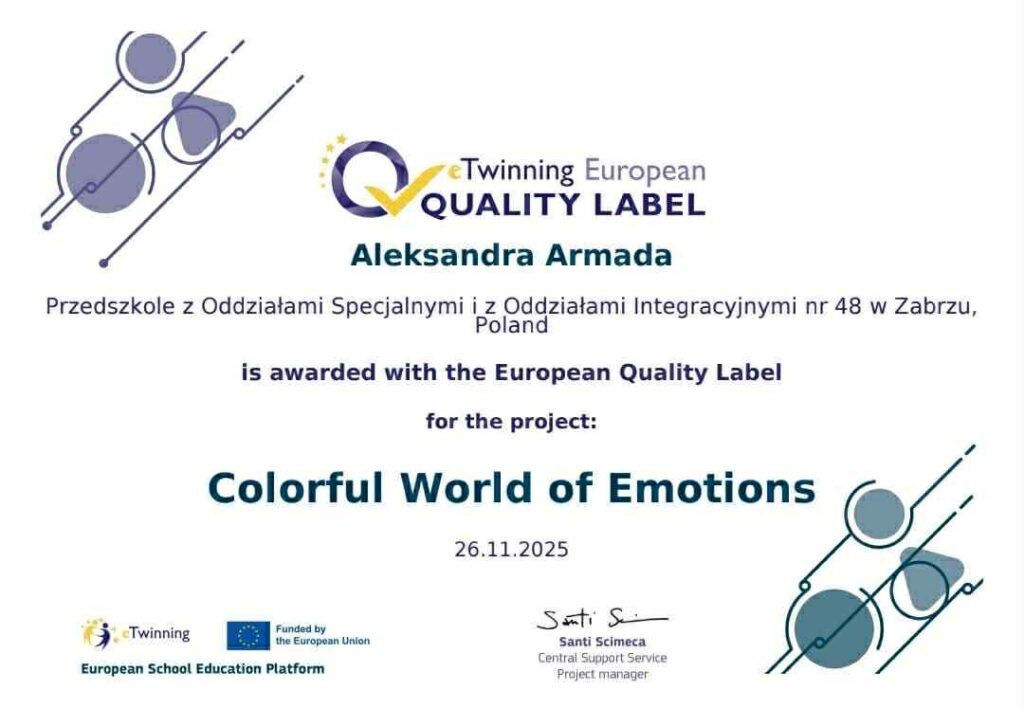 W roku szkolnym 2022/2023 w Przedszkolu z Oddziałami Specjalnymi i z Oddziałami Integracyjnymi nr 48 w Zabrzu, zrealizowano międzynarodowy projekt „The sense of Rainbow colours”. Był to projekt eTwinning o kolorach, wielobarwnych eksperymentach i polisensorycznych zabawach z tęczą. W projekcie wzięły udział dzieci w wieku przedszkolnym z Polski, Słowacji, Czech oraz Armenii. Trwał on od października 2022r. do stycznia 2023r. Łącznie w projekt zaangażowało się 6 grup przedszkolnych z oddziałów ogólnodostępnych (1), integracyjnych (2) oraz specjalnych (3). W naszej placówce w projekt zaangażowane były 2 grupy: II „Motylki” (Aleksandra Armada) oraz IIIs „Duszki” (Paulina Stiler). Projekt został zapoczątkowany po międzynarodowej konferencji kontaktowej w Warszawie, odbywającej się pod hasłem „Creative learning environment at kindergarten”. “The sense of Rainbow colours” został nagrodzony Krajową Odznaką Jakości, Europejską Odznaką Jakości oraz znalazł się w gronie laureatów w konkursie “Nasz projekt eTwinning 2024” zajmując II miejsce w Polsce, a także jest zwycięskim projektem w Europie w kategorii wiekowej od 0 do 6 lat.